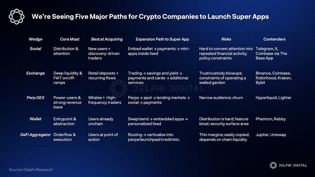 Coinbase 以 Base 作为操作系统,Base App 作为用户界面,USDC 收入作为交易底线,Deribit 用于衍生品交易。Robinhood 的 Gold 会员同比增长 77%,并发挥着用户留存的作用。Binance 已达到超级应用的规模,拥有超过 2.7 亿用户和 2500 亿美元的支付交易量。当分发成本降低时,价值将归于拥有用户的人。2026 年,赢家将开始拉开差距。
