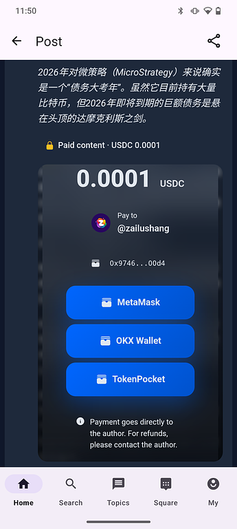 Added OKX and #TokenPocket payment support. OKX refers to the main OKX exchange app (with built-in Web3 wallet), not the standalone #OKX Wallet app. Together with MetaMask, mobile users can now pay with three major wallets to unlock paid content via USDC.